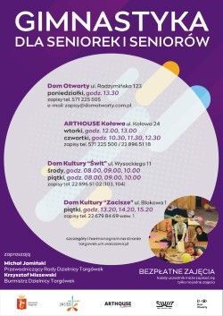 Informujemy, że w Domu Kultury Zacisze kontynuowane są zajęcia z Gimnastyki dla Seniorek i Seniorów w ramach programu „Zajęcia gimnastyki dla seniorów Dzielnicy Targówek m.st. Warszawy”.