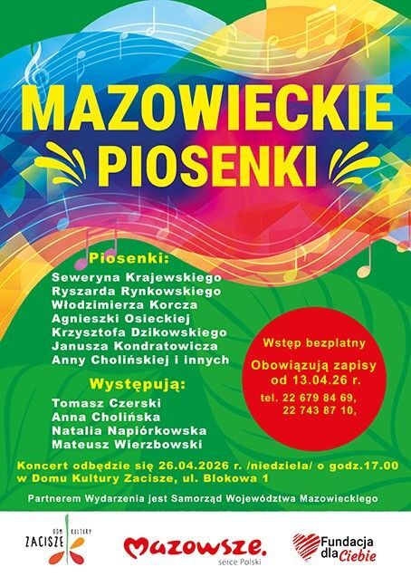 W programie koncertu piosenki rozrywkowe: znane i lubiane oraz nowe autorskie, twórców związanych z Mazowszem. Usłyszymy piosenki : Seweryna Krajewskiego, Ryszarda Rynkowskiego, Włodzimierza Korcza, Agnieszki Osieckiej, Krzysztofa Dzikowskiego, Janusza Kondratowicza,Anny Cholińskiej i innych. Słowo wiążące przybliży publiczności sylwetki twórcze tych artystów.