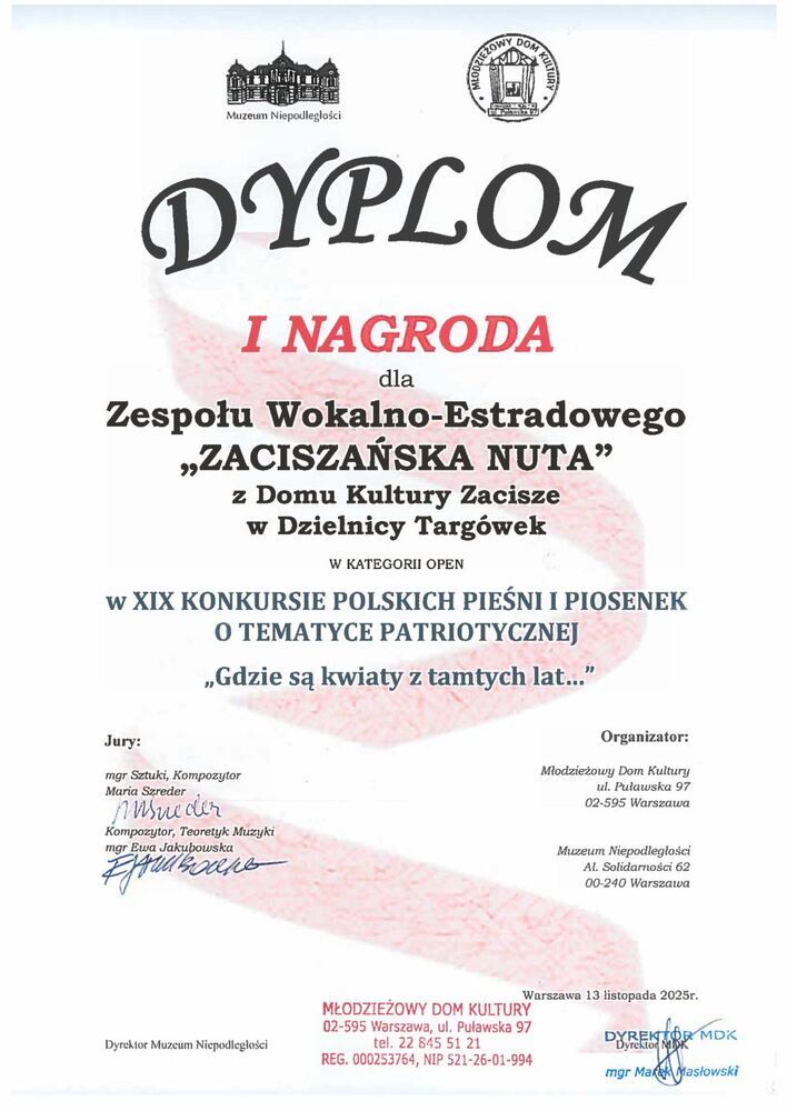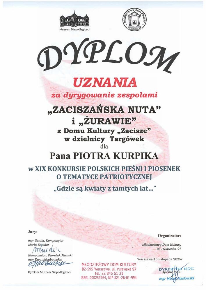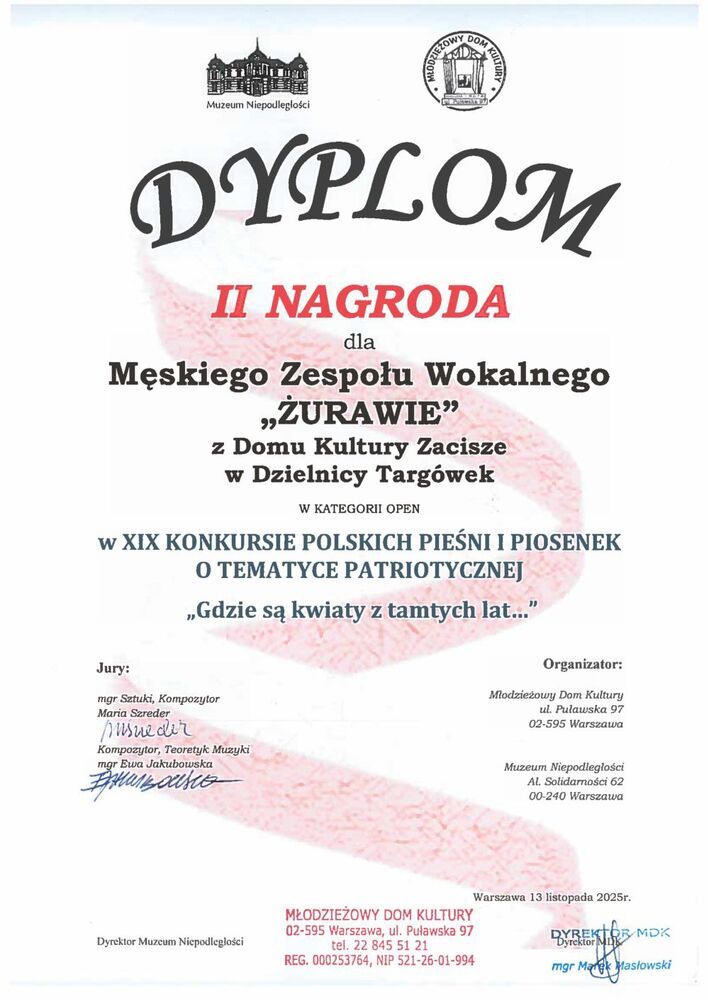 Już po raz kolejny nasze zespoły UTW "Zaciszańska Nuta" i "Żurawie" pod kierownictwem Piotra Kurpika biorą udział w konkursie polskich pieśni patriotycznych i piosenek o tematyce patriotycznej "Gdzie są kwiaty z tamtych lat" organizowanym przez Młodzieżowy Dom Kultury na Mokotowie w Warszawie przy ul. Puławskiej.