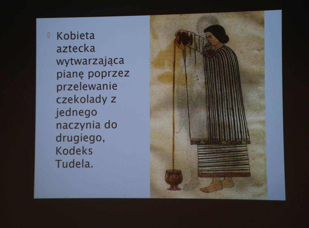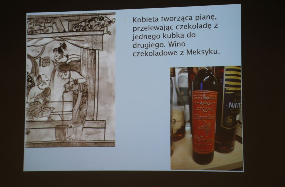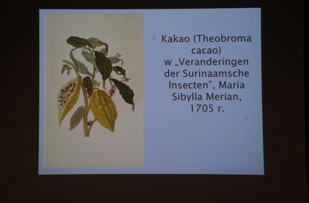 Prelegentka zaprezentowała uchwycone w sztuce wierzenia w nadzwyczajne moce czekolady, prezentacje owoców kakaowca i wina czekoladowego.